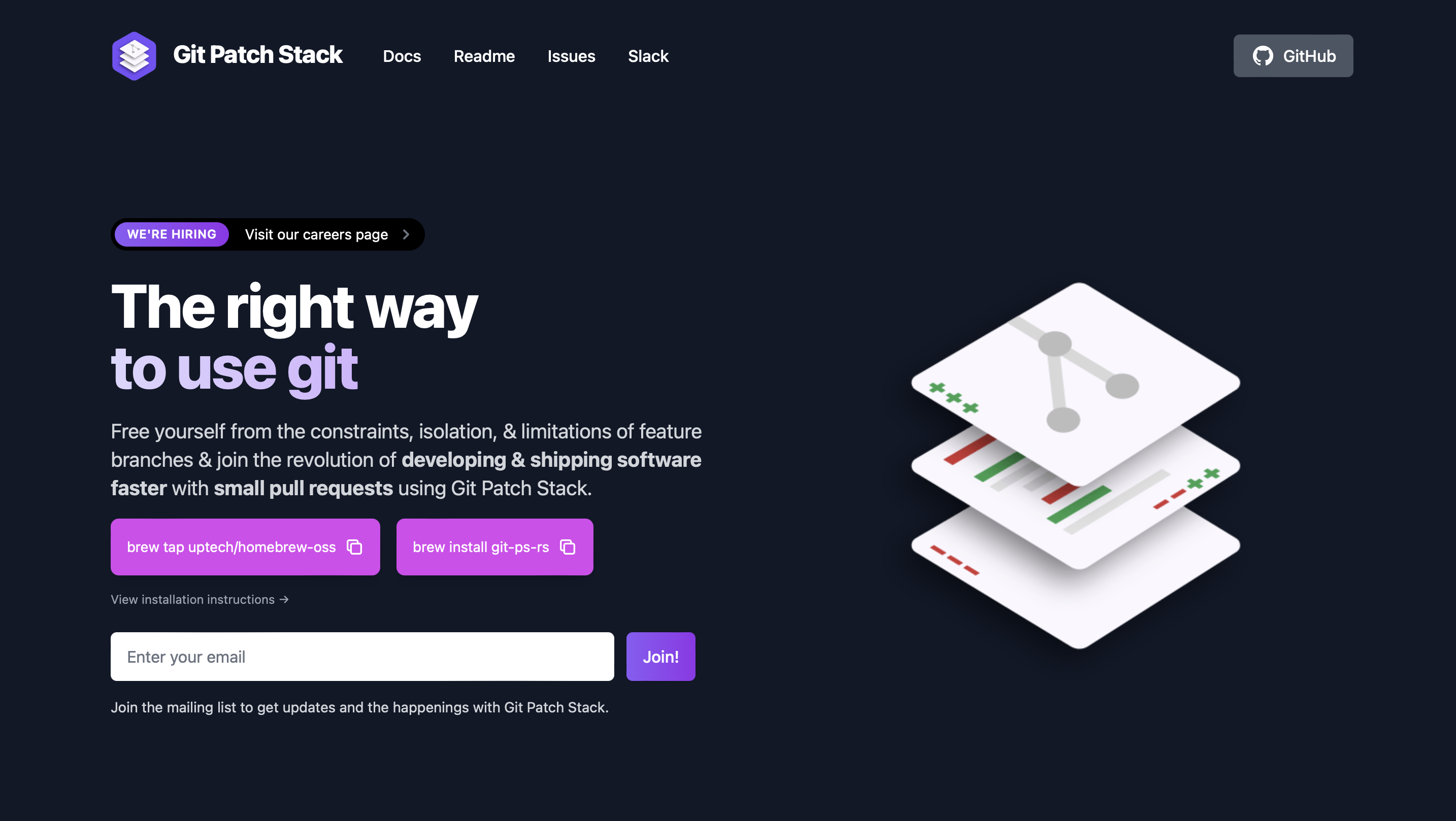 Git Patch Stack is an OSS command line tool that facilitates a Patch Stack based workflow with Git. Allowing you to free yourself from the constraints, isolation, & limitations of feature branches & join the revolution of developing & shipping software faster with small pull requests using Git Patch Stack.