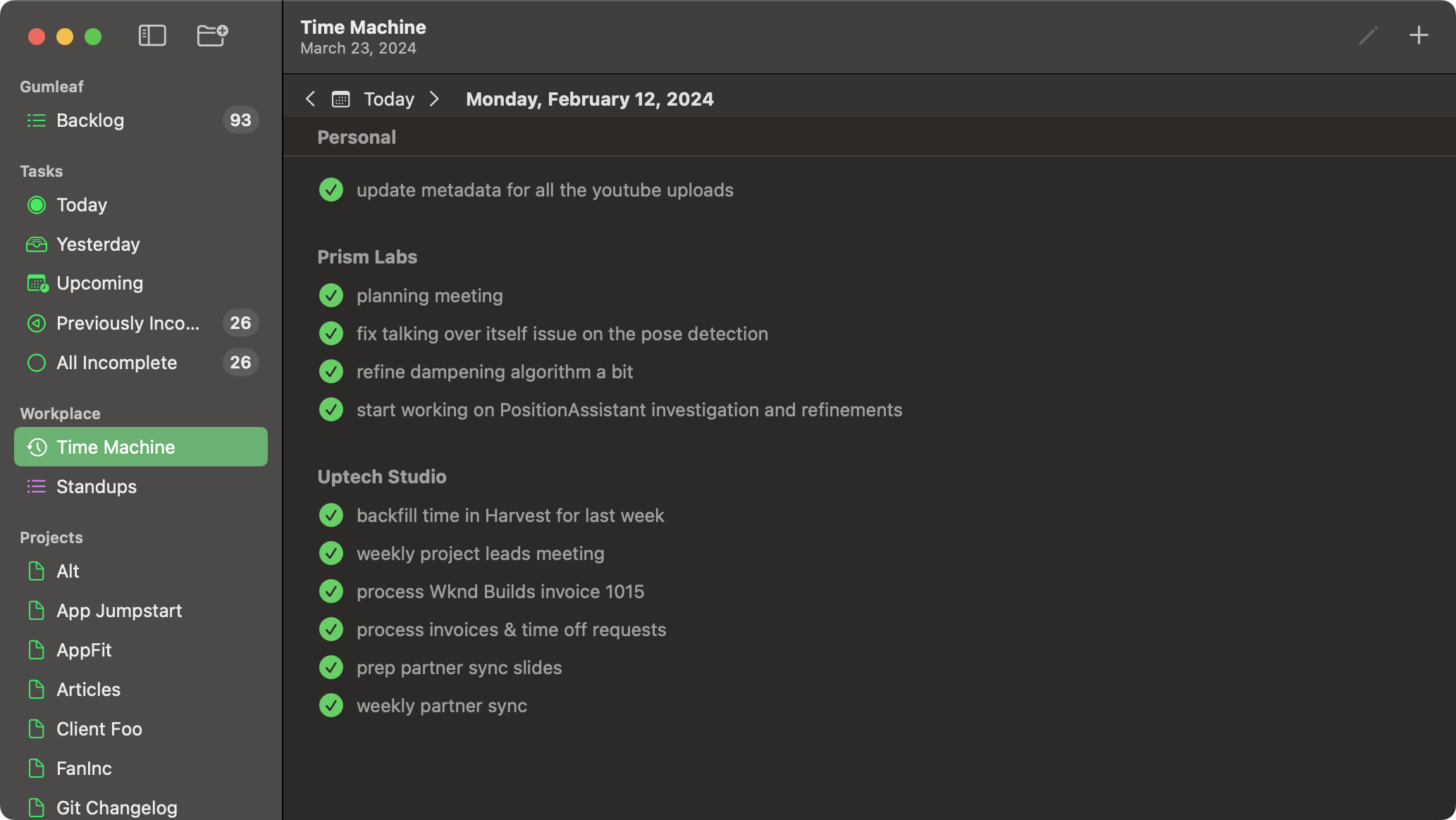 Gumleaf is a personal task management application for macOS & iOS/iPadOS built around the concept of daily standups and managing your tasks in terms of days. It also has the ability to export your tasks to a Slack format for sharing your daily standup with your team.