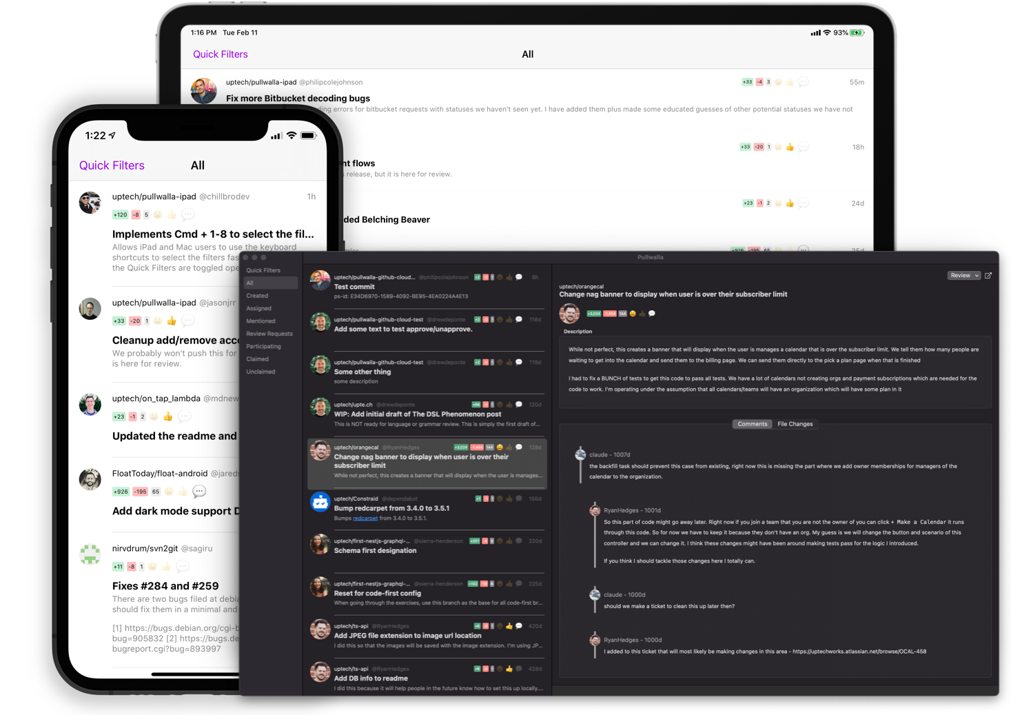 Pullwalla is a macOS, iOS, and iPadOS app designed to help developers have a single place to discover and manage the pull requests that they need to review across GitHub, GitHub Enterprise, Bitbucket, and Bitbucket Server. This is especially useful when you are on a team that is responsible for multiple repositories even if they are spread across multiple SCM services.