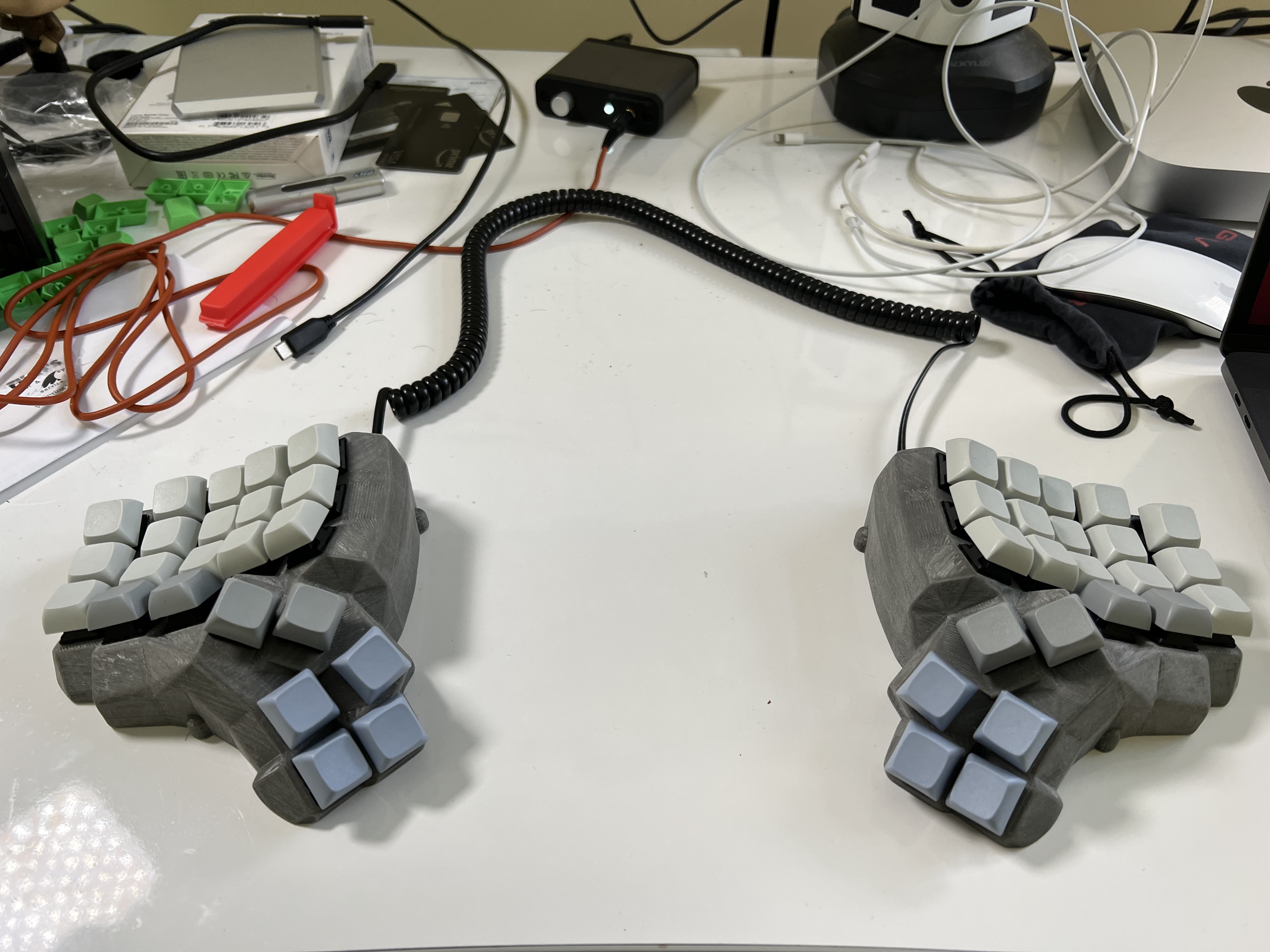 This is a project in which I have created a custom keyboard based on the Dactyal Manuform so that I no longer have wrist pain. It involved first coming up a shape that would allow me to minimize repedative stretching of my fingers. Turns out this required reducing the size of the keyboard down to a smaller 4x5 layout. Which in turn required coming up with a shape and position where the entire thumb cluster would be comfortably functional. Finally, it required figuring out a multi-layered keyboard layout that would allow me to efficiently write code as well as play video games. More details are avaliable on the Custom Keybard Project Page.